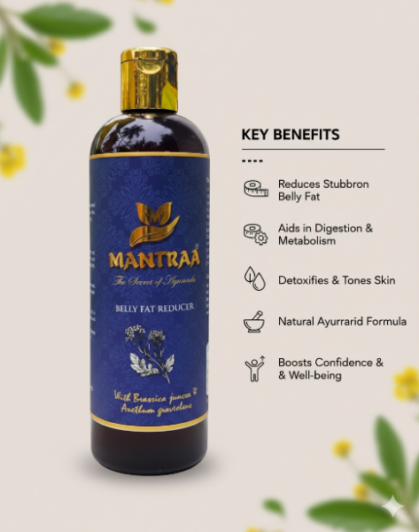 Mantraa Belly Fat Reducer Oil: Unlock ancient Ayurvedic secrets for a flatter, firmer tummy. This potent blend targets stubborn belly fat, aids digestion, and tones skin naturally. Embrace a more confident you, the Ayurvedic way!